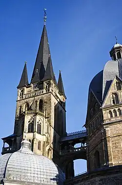 The cathedral mostly uses two distinct architectural styles. First, the core of the cathedral is the Carolingian-Romanesque Palatine Chapel, which was modeled after the Basilica of San Vitale at Ravenna and is notably small in comparison to the later additions. Secondly, the choir was constructed in the Gothic style.[3][4] There are portions that show Ottonian style, such as the area around the throne,[4] and some areas were not completed until the 19th century, in revivalist styles.