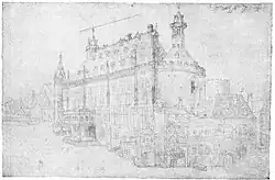 During the Great Fire of Aachen in 1656,[3] portions of the roof and towers burned. The destroyed elements were then replaced in a baroque style.[4] From 1727 to 1732 the Chief Architect of Aachen, Johann Joseph Couven, led a fundamental baroque remodeling of the structure, especially of the front façade and entry steps. The gothic figures and muntin adorning the windows were removed, and even the interior was remodeled in the baroque style. Today, the sitting room and the "White Hall" both still convey this change in style.