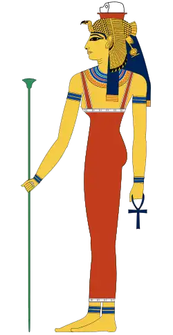 She is depicted three times on the tomb walls of Qarat Qasr Salim, Bahariya Oasis, including twice in the Tomb of Bannentiu.[1][2] In these representations, she was in an anthropomorphic form, wearing a tripartite wig with a vulture cap, with a hedgehog on top that was specific to her.[3] In the Tomb of Bannentiu, there is also an inscription that includes the goddess, which is one of only two attestations of her name.[4]