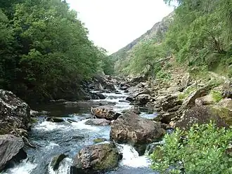 The Aberglaslyn Pass (Welsh: Bwlch Aberglaslyn) is a narrow gorge of considerable beauty in Snowdonia, Gwynedd, north Wales. The A498 road/A4085 road follows a relatively level route along the Afon Glaslyn through the pass from Beddgelert to Prenteg and then continues at the edge of the Traeth Mawr via Tremadog to Porthmadog.