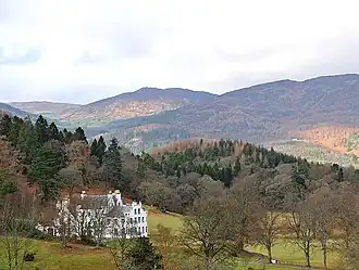 Aberuchill Castle is located 3 kilometres (1.9 mi) west of Comrie in Perthshire, Scotland. It comprises an early 17th-century tower house, which was extended and remodelled in the 19th century. The house, excluding the later west wing, is protected as a category A listed building,[1] while the grounds are included in the Inventory of Gardens and Designed Landscapes in Scotland.[2]