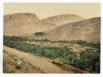 ![]() A view into Wadi Qweilibeh from the flank of Tell Umm al-Amad. The forested strip in the foreground is the course of a stream[1] The structures beyond the stream are a cemetery, with rock-cut tombs up on the far slope. | |