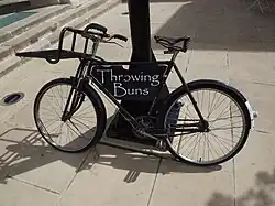 The throwings are attended by thousands of residents who chant "WE WANT BUNS!" while waiting.[8][1] In the past a musket shot marked the start of the throwing.[12] Other items have been thrown, in 2022 six knitted buns, made by a Didcot-based yarn bomber were thrown.[13] As well as being thrown buns have been launched by catapults and propelled by tennis racquets.[13] For the 2012 event TV presenter James May developed a launching system on his series Man Lab.[2] Those who catch the buns often preserve them as mementoes of the occasion.[3] The use of umbrellas to catch large numbers of buns was banned in 2022.[6] The Abingdon County Hall Museum holds a number of buns from past throwings in its collection.[3] A local cafe is named after the tradition.[3]