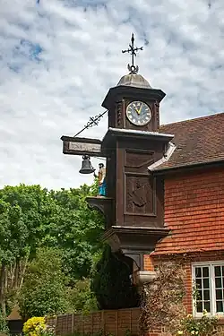 The clock which overhangs the main road portrays the figure of "Jack the Blacksmith", who strikes the hour with his hammer. The clock bears the motto "By me you know how fast to go". The clock was given in memory of the first Lord Farrer of Abinger Hall who died in 1899. The clock represents the iron industry and the role played by the county of Surrey in the industrial past.[4]