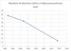 Between 1982 and 1992, the number of abortion clinics in the state decreased by 14, going from 78 in 1982 to 64 in 1992.[24] In 2014, there were 14 abortion clinics in the state.[25] In 2014, 43% of the counties in the state did not have an abortion clinic. That year, 14% of women in the state aged 15–44 lived in a county without an abortion clinic.[26] In 2017, there were five Planned Parenthood clinics, three of which offered abortion services, in a state with a population of 1,614,490 women aged 15–49.[27]