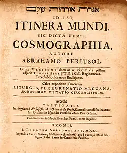 - Farissol, Abraham (1691). Igeret orḥot ʿolam, id est, Itinera mundi sic dicta nempe Cosmographia (in Latin and Hebrew). Translated by Hyde, Thomas. Oxford: Jonath Edwards.