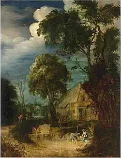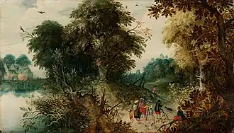 Another major influence was the landscape painter Gillis van Coninxloo.[3] A painting entitled Landscape with River Vale and Falcon Hunt (Museum Mayer van den Bergh, Antwerp) is inspired by the work of Joos de Momper.[5]