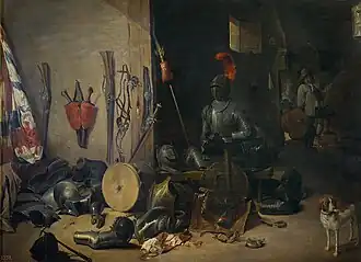 In the second Guardroom Scene attributed to Abraham Teniers the guardroom is dominated by the jumble of disjointed metal armours, breast plates, a drum, weaponry and helmets in the foreground while the peasant soldiers smoking a pipe or drinking in front of a fireplace are kept in the shadows in the background of the picture. The armour depicted in the two pictures was already out of date at the time it was painted since metal armours, breast plates and helmets fell out of use from the 1620s.[9] It is possible that in line with the moralizing intent of the genre, the armour is a reference to the vanitas motif of the transience of power and fame.[10]