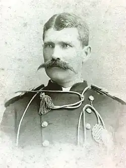 For the next ten months Wood traveled to Europe, where he observed maneuvers of the French Army, and was promoted to captain on June 30, 1883, while in France. He returned to Fort Stanton on January 22, 1884. In May his troop marched to Fort Huachuca, Arizona, where Wood served as post commander and operated in the field against the Chiricahua Apaches. On July 31, 1886, he was posted to Fort Bowie, Arizona, with frequent duty in the field, until September 29, 1887.[4] In early 1887, he married Minnie M. Mansfield in Chicago, Illinois.[8] Her sister was the wife of infantry officer William S. Worth.[9] His troop returned to Fort Huachuca, where it was stationed until May 1890, with Wood taking extended leave for illness for four months in 1888.[4] In the autumn of 1889 the entire regiment assembled at Fort Grant for a camp of instruction and field maneuvers.[10]