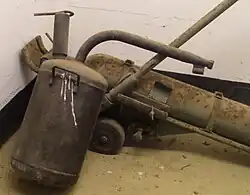 The mine consisted of a large fuel cylinder 53 centimetres (21 in) high and 30 centimetres (12 in) with a capacity of 29.5 litres (6.5 imp gal; 7.8 US gal) containing a black viscid liquid; a mix of light, medium, and heavy oils. A second, smaller cylinder, 67 millimetres (2.6 in) in diameter and 25 centimetres (9.8 in) high, was mounted on top of the fuel cylinder; it contained the propellant powder, which was normally either black powder or a mixture of nitrocellulose and diethylene glycol dinitrate. A flame tube was fixed centrally on top of the fuel cylinder, it was a 50 millimetres (2.0 in) diameter pipe that rose from the centre of the fuel cylinder and curved to extend horizontally approximately 50 centimetres (20 in). When the mine was buried, only the flame tube was normally above ground.