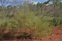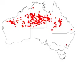Whipstick wattle is native to northern parts of Western Australia, central parts of the Northern Territory,[3][4] parts of central Queensland and in far north east South Australia near Lake Eyre. The range extends from around Roebourne in the west through central Queensland in the east. It is found flat plains and hillsides[6] growing in reddish sandy, loamy and gravelly soils and is usually part of spinifex grassland communities.[6]