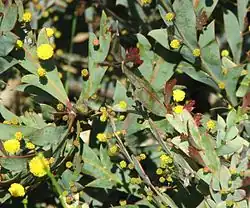 It is a spreading or erect shrub which ranges in height from 0.3 to 1.2 metres (1.0 to 3.9 ft) and up to 2 m (6.6 ft) in width. It produces yellow, globular flowers between late winter and early summer.[2] It has glabrous straight to slightly flexuose branchlets. Phyllodes are continuous with the branchlets, forming opposite wings with each one extending to the one underneath. Each one is mostly 2.5 to 7 centimetres (1.0 to 2.8 in) in length and 0.6 to 2 cm (0.2 to 0.8 in) wide. The free portion of phyllode usually 1 to 4 cm (0.4 to 1.6 in). The rudimentary inflorescences rudimentary with globular flower heads that have a diameter of 5 to 6 mm (0.2 to 0.2 in) containing 30 to 80 golden flowers. After flowering black, glabrous, twisted and coiled seed pods are formed that are up to 2 cm (0.8 in) long and 2 to 3 mm (0.1 to 0.1 in) wide. The seeds are longitudinally arranged in the pods. They are oblong in shape with a length of 2.5 to 3.5 mm (0.1 to 0.1 in).[3]