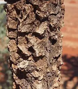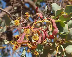 Kanji bush is a gnarled tree or shrub with a single trunk,[2] corky bark, spiny foliage and stems. It grows to a height of between 2 and 5 m (6 ft 7 in and 16 ft 5 in) but can reach as high as 8 m (26 ft).[1] It has thick, rough, corky, dark grey to black coloured bark on the main trunk that is often scarred by fire.[2] Like most Acacia species, it has phyllodes rather than true leaves. These are a blue-grey colour, with a curved midrib and a short spine at the tip. There is also a pair of curved spines at the base of each leaf. The leathery phyllodes have an asymmetrically ovate to elliptic shape. They are 1.5 to 7 cm (0.59 to 2.76 in) in length and 6 to 45 mm (0.24 to 1.77 in) wide and the apex terminates in a needle-sharp tip.[2] Unusually for Acacia species, the flowers are not pure yellow, but rather yellow with a reddish purple centre. The flowers occur between May and October.[1] are held in spherical clusters about 5 mm (0.20 in) in diameter. The pods are flat and curved, up to 10 cm (3.9 in) long and 1 cm (0.39 in) wide. They can be strongly curved to coiled and are raised high over the seeds and slightly constricted between. The pods have a pale maroon colour when young but deepen to a mid-brown or pinkish-purplish brown as they age. The dull dark brown seeds within are arranged longitudinally oblique within the pod. Each seed has a length of 4 to 6 m (13 to 20 ft) and has an obloid to globose shape.[2]