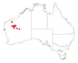 It is native to an area in the Pilbara and Goldfields regions of Western Australia with the bulk of the population found between Meekatharra and Newman where it is found on stony ridges, shape slopes and saline drainage floors where it grows in calcrete and alkaline clay soils.[1]