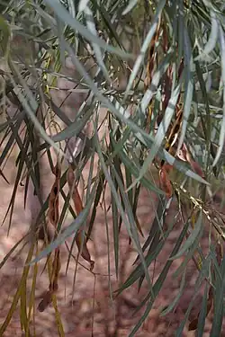The evergreen tree or shrub typically grows to a height of 3 to 8 m (9.8 to 26.2 ft) and a width of up to 8 m (26 ft).[1] It often has an erect to spreading habit with flattened or angled branchlets towards the apices. The branchlets are finely haired with silvery white hairs that can be yellowish on young shoots and are often covered in fine white powder. Like most species of Acacia it has phyllodes rather than true leaves. The silvery-green coloured phyllodes have a more or less linear to narrowly elliptic shape and are straight or slightly curved. The phyllodes are around 5 to 15 cm (2.0 to 5.9 in) in length and 4 to 9 mm (0.16 to 0.35 in) wide and covered in fine hairs and have a prominent midvein.[2] It blooms between July and October producing inflorescences in groups of 8 to 20 on an axillary raceme along an axis of 3 to 9 cm (1.2 to 3.5 in). The spherical flower-heads have a diameter of 3.5 to 7 mm (0.14 to 0.28 in) and contain 20 to 40 yellow to bright yellow flowers. Following flowering thinly leathery, flat seed pods form that are straight to slightly curved with a length of 6 to 18 cm (2.4 to 7.1 in) and a width of 6 to 10 mm (0.24 to 0.39 in).[2]