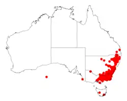 It is found in southwestern parts of Queensland, western New South Wales and Victoria on the tablelands of the Great Dividing Range. It is often a part of open woodland or dry sclerophyll forest communities and grows on rocky hilltops and slopes in rocky soils[2] and in alluvial soils along rivers and creeks. The bulk of the population is found between the Black Range in northeast Victoria in the south up to near Stanthorpe in south-eastern Queensland.[4]