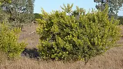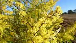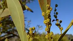 The shrub or tree has an erect to bushy habit and typically grows to a height of 2 to 10 m (6 ft 7 in to 32 ft 10 in) and has lightly fissured brown bark. It has narrowly elliptic to oblanceolate shaped reddish to grey-green leathery phyllodes that have a length of 5 to 20 cm (2.0 to 7.9 in) and a width of 8 to 25 mm (0.31 to 0.98 in). The juvenile foliage is pinnate and can persist on older plants. It blooms between July and November producing inflorescences with pale to bright yellow flowers.[2] The simple inflorescences are found in groups of 5 to 29 in an axillary racemes with an axis that is 1 to 10 cm (0.39 to 3.94 in) in length. The spherical flower-heads have a diameter of 5 to 7 mm (0.20 to 0.28 in) and contain 9 to 15 pale to bright yellow coloured flowers. Following flowering firmly papery to thin leathery, glabrous seed pods form that are straight and flat with a length of 4 to 12 cm (1.6 to 4.7 in) and are 6 to 9 mm (0.24 to 0.35 in) wide and are often covered in a powdery white coating.[2]