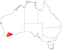 It is native to an area in the Great Southern, Goldfields-Esperance and Wheatbelt regions of Western Australia where it is commonly situated on plains along creeks and rivers growing in rock or sandy loams or sandy-clay or sandy soils often over or around granite.[1] The range extends from just south of the Stirling Range in the north-west out to around Ravensthorpe in the south east with outliers near Nyabing and Lake King both of which are further north.[2]