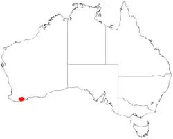 It is native to an area in the Great Southern region of Western Australia where it is commonly situated in sheltered sites near summits and in gullies along creeks and streams.[2] The range of the plant is contained within the Stirling Range National Park as a part of Eucalyptus marginata - Corymbia calophylla or Eucalyptus wandoo woodlands or forest communities.[1]