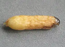 Usually females lay their eggs in the pupal case. P L Jørgensen observed some females leaving their cases and dropping to the ground a few days after mating. The female, when free from its pupal case, looks and behaves like a fly maggot. Eleven were fed to a European robin (Erithacus rubecula) and its droppings collected over the next 24 hours. After two weeks, between thirty and forty larvae hatched, constructed cases and started to feed. The observation suggests that the eggs can survive unscathed inside a bird's gut, and is an example of species dispersal.[3][6]