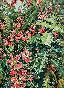Acanthus arboreus grows best in well-draining soil under full sun to partial shade and is adaptable to cooler climates, enduring temperatures as low as –5°C.[4] The plant features spoon-shaped, spiny-edged green leaves and produces pink flowers on tall stems during summer. It can reach heights of 4 to 19 feet and is known for its drought tolerance.[5][6][7] It grows well on steep grassy hills, especially on the western slopes at heights between 1,000 and 3,000 meters.[8]