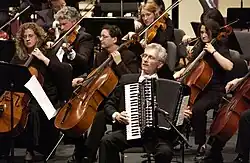 A number of American instrumentalists did succeed in demonstrating the unique orchestral capabilities of the free bass accordion while performing at the nation's premier concert venues. In the process they encouraged contemporary composers to write for the instrument. Included among the leading orchestral artists was John Serry, Sr. A concert accordionist, soloist, composer, and arranger, Serry performed extensively in both symphonic orchestras and jazz ensembles as well as on live radio and television broadcasts.[37][38][39] His refined poetic artistry gained respect for the free bass accordion as a serious concert instrument among prominent classical musicians and conductors of the early 20th century.[40] In addition, his Concerto For Free Bass Accordion was completed in 1966 and illustrates the vast orchestral potentialities of the instrument.[41][42][43][notes 5]