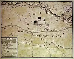 Historically, ditch irrigation was used for centuries by the indigenous peoples of the Southwest, however the Spanish colonialists have been credited with bringing knowledge of engineering and irrigation/water regulation law to New Mexico.[1] The Acequia Madre was documented in the José de Urrutia map (c. 1766)[2] which shows the acequia running along the muralla, or early fortification wall of Santa Fe, and marks its position in relation to the Santa Fe River.[1]