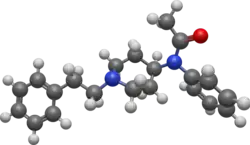 Acetylfentanyl (acetyl fentanyl) is an opioid analgesic drug that is an analog of fentanyl.[4] Studies have estimated acetylfentanyl to be 15 times more potent than morphine,[5][6] which would mean that despite being somewhat weaker than fentanyl, it is nevertheless still several times stronger than pure heroin. It has never been licensed for medical use and instead has only been sold on the illicit drug market. Acetylfentanyl was discovered at the same time as fentanyl itself and had only rarely been encountered on the illicit market in the late 1980s. However, in 2013, Canadian police seized 3 kilograms of acetylfentanyl.[7] As a μ-opioid receptor agonist, acetylfentanyl may serve as a direct substitute for oxycodone, heroin or other opioids. Common side effects of fentanyl analogs are similar to those of fentanyl itself, which include itching, nausea, and potentially fatal respiratory depression. Fentanyl analogs have killed hundreds of people throughout Europe and the former Soviet republics since the most recent resurgence in use began in Estonia in the early 2000s, and novel derivatives continue to appear.[8][9][10]