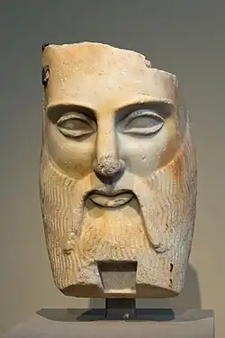 Achelous as a cultic figure is attested as early as the seventh century BC. The 2nd-century geographer Pausanias, reports seeing, near Megara, an altar to Achelous erected by the seventh-century BC "tyrant", Theagenes of Megara.[75] Achelous was the only river-god to achieve Panhellenic cult status. By the fifth century BC he shared many sanctuaries with his daughters the nymphs.[76] Achelous appears in many votive reliefs which often include nymphs. Such reliefs were given as dedications in sanctuaries.[77] A votive relief (Athens 1488), dedicated to "Pan and the Nymphs", shows Hermes leading three nymphs in a cave, with a relief head of Achelous depicted on the wall of the cave.[78] In a similar votive relief (Athens 1859), Achelous is depicted as a bull with a human head.[79] Achelous could also be venerated in the form of stylized votive masks, similar to the cult masks of the wine-god Dionysus.[80] A well-known example of such a cult mask, considered to be Achelous, is a marble mask (c. 490–470 BC) from Marathon (Berlin SK 100).[81]