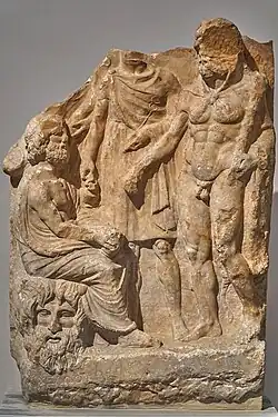 Beginning in the late fifth century BC, Achelous also appears in many votive reliefs. Such reliefs often include his daughters the nymphs.[112] Three marble Attic reliefs (Athens 1445, 1448, and 1859) have the form of a cave, with four central figures, a male leading three nymphs, all holding hands gathered around a small stone altar (dancing?). Achelous, along with other figures, is represented as being carved into the cave wall. In two of these (1448 and 1859, pictured above) the male central figure is Hermes, in the other he is Pan. Votive reliefs without nymphs are also common. A votive relief (Athens 1778), dedicated to Zeus and found near the Ilissos river, shows Zeus sitting on a stone seat decorated with the face of Achelous.[113]