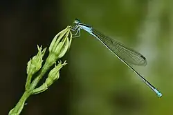 It is a long slender damselfly with a black spot in blue on the 8th segment of the abdomen. Its thorax is black with lateral azure blue stripes. Its abdomen is extremely slender with black on dorsum of segments 1 to 7 and light blue on the lateral sides. Segment 8 is blue with a narrow triangle black dorsal spot, segment 9 is blue. Segment 10 is black on dorsum and blue on the sides. Female is similar to the male except in the last three abdominal segments. Segment 8 has a broad black mark on dorsum, 9 with a small basal dorsal spot, and 10 is entirely blue.[6][7][8][3][4]