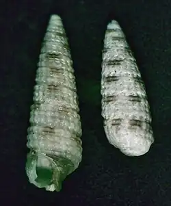 These small snails have left-handed shells (adult size from 6 – 12 mm) with very high spires.