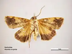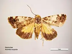 Acontia moths are characterized by an elongated palpi having pointed frontal tuft, and a well developed third segment. Antennae are simple and filiform, having no complex modifications or branches. Both the thorax and abdomen are covered in smooth scales, lacking tufts or patches. The forewing is bordered with non-crenulate cilia, and plain unnotched fringe along the edges. In terms of venation, veins 7 to 10 are stalked. The larval stage is characterized by the presence of four pairs of abdominal prolegs.[2]