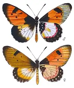 - welwitschi Rogenh. (54 d; 60 g). male. Forewing orange-red, above more or less black at the base and with black marginal band, often dentate proximally, at vein 2 still about 2 mm. in breadth; hindwing with white median band and very broad black marginal band, ill-defined proximally. In the female the forewing has a dull ochre-yellow ground-colour and a narrower marginal band; median band of the hindwing yellowish, only in the middle whitish, and above much broader than in the male. Angola.