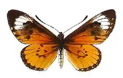 A. wigginsi Neave. Forewing above blackish at the costal margin, in the apical part and at the distal margin, with a broad white subapical band in cellules 3 to 6, 9 and 10 and often also with yellow marginal spots; the cell and cellules 1a to 2 red-yellow as far as the marginal band; a black dot in the cell and a transverse spot at its apex and also discal dots in 1b to 5 or at least in 1b to 3; hindwing above golden yellow with narrow, yellow-spotted marginal band; forewing beneath as above, but lighter and at the distal margin grey with black veins; hindwing beneath light yellow with narrow white-spotted marginal band, which is proximally accompanied by gold-yellow quadrate spots, and between the discal and basal dots with an irregularly broken red transverse band, in addition with a red spot at the base of cellules 1c and 8. The female only differs in having the red-yellow colour on the forewing above less extended. Expanse 46 to 56 mm. British East Africa and Uganda.[4]