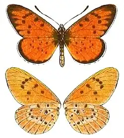 A. zitja Bdv. (55 g). Both wings above brick-red with narrow black marginal band, which is more or less proximally prolonged at the veins; the forewing in addition with black costal margin, with a black dot in the cell, a larger one at the end of the cell and free black discal dots in 1 b to 6; hindwing above with some basal dots and with discal dots in 1 c to 7; forewing beneath without dark marginal band but with the extremities of the veins black, otherwise marked as above. The hindwing beneath with reddish ground-colour and with a narrow whitish median band, at the proximal side of which the discal dots are placed; the whitish colour of this band is continued to the distal margin as light lines at each side of the veins; the small transverse light marginal spots are proximally bordered by black streaks, which, however, do not touch in the middle. Madagascar. - ab. radiata Guen. differs in having the light bordering of the veins in the marginal band of the hindwing beneath much broader than in the type-form; the females have a yellow-brown ground-colour. Madagascar. - female ab. calida Btlr. [ now species Acraea calida resembles radiata but has, instead of the marginal band of the upper surface, triangular black spots at the extremities of the veins. Madagascar. In ab. rakeli Bdv. the light bordering of the veins is entirely absent in the distal part of the hindwing beneath and also the proximal bordering of the marginal spots is often indistinct; hence the marginal band becomes almost unicolorous. - female ab. fumida Mab. has a grey ground-colour, on both wings relieved with whitish at the discal dots; the marginal band on the underside of the hindwing apparently always agrees with that of rakeli. Madagascar. [4]