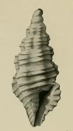 Sculpture :—There are six perpendicular subcontinuous radial ribs. These are crossed by cords which project on the summits of the ribs, and which amount to nine on the body whorl and four on the penultimate whorl. The aperture is trigonal, with a short open siphonal canal and a wide effuse sinus. The varix projects a free limb towards the aperture. On the columella are three transverse plaits, which lengthen in ascending. [2]