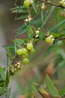 Acrotriche leucocarpa is a species of flowering plant in the family Ericaceae and is endemic to south-eastern continental Australia. It is an erect, bushy shrub with sharply-pointed lance-shaped leaves and spikes of 3 to 5 green, tube-shaped flowers and spherical to oval, translucent white drupes.
