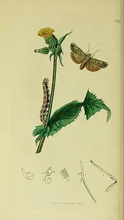 Moth and larva (figures 4) alongside related species in Karl Eckstein Die Schmetterlinge Deutschlands