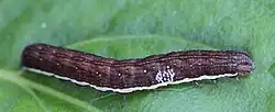 A. polyodon Cl. (= perspicillaris L.) (15 d). Forewing bone-colour suffused with olive brown along costa and inner margin and interrupted along termen; the reniform stigma also placed on an olive brown cloud: costa and space between veins 2 and 4 tinged with purplish pink; a black streak from base in submedian fold and a double one from inner margin near base; reniform stigma large, pale olive with linear centre and outline creamy white; veins towards margin dark, forming centre of wedgeshaped marks, 3, 4 and 7, 8 broadly edged with ground colour and cutting the dark fringe; outer line marked by dark dots on veins: hindwing bone-colour with broad brownish margin and blackish veins. - Larva red-brown, dotted with black; a subdorsal row of oblique brown marks; dorsal and spiracular lines yellow; head brown.