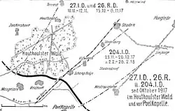 After 23 October, the French prepared for Operation Y, to occupy all the ground from Houthoulst Forest to Blankaart Lake as the British advanced to Passchendaele and Westroosebeke. The 133rd Division moved into line between the 1st and 51st Divisions, from Martjewaart to Saint-Jansbeek and ferme Carnot.[37] On 26 October, XVIII Corps attacked the defences of Flandern I Stellung, a mixture of pillboxes, blockhouses and fortified farmhouses, with the 63rd (Royal Naval) Division and the 58th (2/1st London) Division, in support of the Canadian Corps to the right on Passchendaele Ridge. The divisions attacked up the Lekkerboterbeek towards Westrozebeke but deep mud reduced the advance to a crawl. The creeping barrage moved forward too fast, rifles clogged with mud and the British fell back to the start line where they could or were surrounded by the Germans and overrun. XIV Corps attacked with the 57th (2nd West Lancashire) Division and the 50th (Northumbrian) Division but the ground was in a dreadful condition; on the left flank the French 1st Division and the 133rd Division managed a short advance into the south-west corner of Houthulst Forest. The attacks cost the Fifth Army 5,402 casualties, 949 in the 63rd (Royal Naval) Division, 1,361 in the 58th (2/1st London) Division, 1,634 in the 57th (2nd West Lancashire) Division and 1,458 men of the 50th (Northumbrian) Division.[57]
