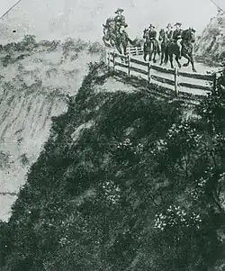 This obelisk was erected as a memorial to the famous Australian poet. From near this spot in July, 1864, Gordon made his famed leap on horseback over an old post and rail guard fence onto a narrow ledge overlooking the Blue Lake and jumped back again onto the roadway. The foundation stone of the Gordon Memorial Obelisk was laid on 8th July 1887.[7]