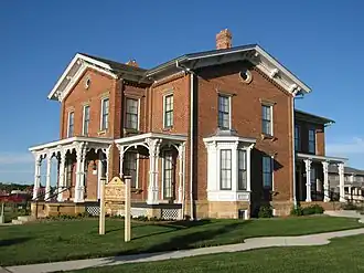 The house was placed on the National Register of Historic Places in 1998.[1] It is a two-story cross-gable main section with a two-story rear-gabled wing, built of load-bearing brick masonry walls. Italianate aspects include its scrolled brackets, limestone sills supported by brackets, brick dentil molding below the cornice, wood dentil molding above. It was built on a limestone ashlar foundation. The front facade's main feature is a one-story porch with a flat roof, single and triple columns, and scrolled brackets.[3]