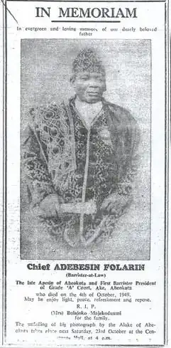 Folarin was one of Alake Ademola's closest advisers, and was granted the honorary chieftaincy titles of: Bobajiro (Oba's adviser), Otunbaloye of Igbore.[19] Alake Ademola engaged Folarin to document the history of the Egba people and codify its customary laws. His texts included A short historical review of the life of the Egbas from 1829 to 1930 (1931) and The laws and customs of Egba-land (1939),[16] both of which are reference books in leading libraries around the world, including Harvard and Yale University Libraries and the British Library.[20][21] His books have also been cited by the Federal Supreme Court of Nigeria.[22]