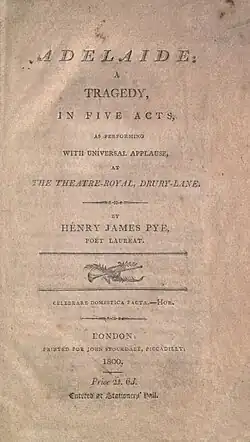 Adelaide is an 1800 historical tragedy by the English writer and poet laureate Henry James Pye.[1] It premiered at the Theatre Royal, Drury Lane in London on 25 January 1800.[2] The original cast included Sarah Siddons as Adelaide, James Aickin as King Henry, John Philip Kemble as Prince Richard, William Barrymore as Prince John, Charles Kemble as Clifford, Thomas Cory as Legate and Walter Maddocks as Officer and Elizabeth Heard as Emma. It is set during the reign of Henry II.