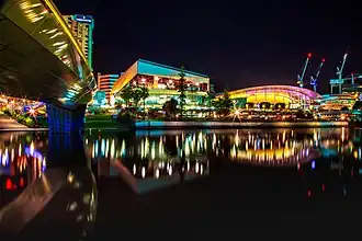 Looking over Torrens Lake, the centre is home to most of Adelaide's major conventions.[9] It has also been the location of some significant commemorations of Australian icons.[10] AVCon, an annual anime and video games convention was held at the Adelaide Convention Centre from 2009[11] until 2019, and again in 2023 following a three-year hiatus due to the COVID-19 pandemic. It has since been relocated to Adelaide Showground.