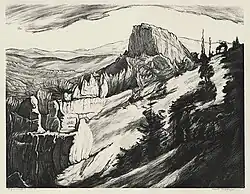 Taking inspiration from some of Arthur B. Davies's quasi-symbolist paintings (e.g., A Measure of Dreams), Watson's early work is frequently characterized by otherworldly nude female figures set in natural landscapes.[4][9] Beginning around the 1930s, her later paintings and lithographs began to blend landscape and the human form together, so that anthropomorphic figures seem to emerge out of dreamlike terrain.[18][9] This shift in Watson's work occurred predominantly in response to her experience of the landscapes of Zion National Park and Bryce Canyon National Park.[4][9][18] She made several similar coastal scenes as well,[18][19][20] some of which depict the coast of Maine.[21]