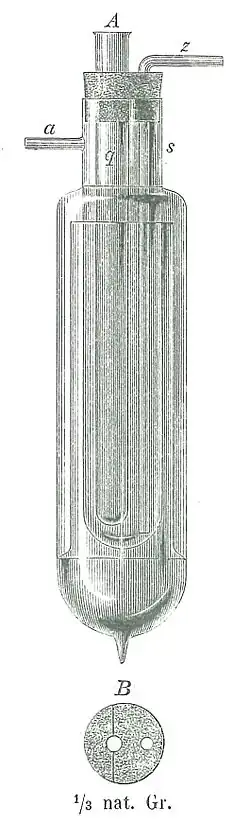 In 1881, he applied the vacuum flask of James Dewar to chemistry, using it as a cold trap. The flask itself was patented in 1903 by the glassblower Reinhold Burger, who founded Thermos GmbH on its basis.[1]