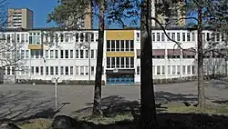 The Farsta campus with street address Farstavägen 118 in Farsta, a district of Farsta borough south of Stockholm, has had different names over the years. The white building, designed by architect Lennart Brundin, was finished in 1963 and was originally named Farsta läroverk (English: Farsta grammar school). The name was changed to Farsta gymnasium (English: Farsta high school) in 1967. From 2015 the name is Farsta grundskola (English: Farsta primary school).[13][14]