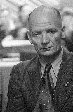 Adolf Hennecke, 43, was chosen to initiate a Stakhanovite activist effort in the Soviet occupation zone in imitation of the Soviet movement named after the Soviet miner Alexey Stakhanov. The Lugau-Oelsnitzer coalfield was underperforming, producing less coal in 1948 than in 1938 and 8.8% less than the previous year.[1] The local labor management and party representatives sought to demonstrate that far higher production levels were possible. Hennecke obtained this assignment after the young miner Franz Franik refused to set such a performance record when extracting a layer of coal, fearing the reaction of his colleagues.[2] At first, Hennecke too refused the task (because he was afraid of the reaction of his colleagues to such a norm-breaking effort) but finally he declared himself ready to try for a record performance. On 13 October 1948, the first anniversary of the 1947 implementation of the Soviet Military Administration's Order 234 reorganizing the economy on Soviet principles,[1] Hennecke entered the Karl Liebknecht shaft of the Lugau-Oelsnitzer mine with two fellow SED members and a union representative and extracted in the course of a 13-hour shift more than 24.4 m3 (860 cu ft) of coal (instead of the normal 6.3 m3 (220 cu ft)) from a layer that Hennecke has prepared the day before.[3] This volume represented 387% of the usual performance standard.[4] As a reward, he received 1.5 kg (3.3 lb) of fat, three boxes of cigarettes, a bottle of brandy, 50 marks, and a bouquet of flowers.[5]